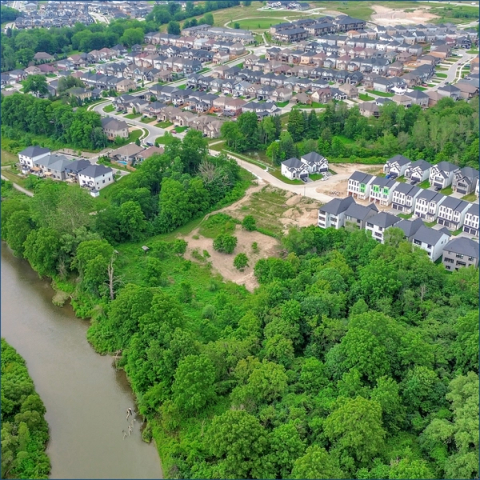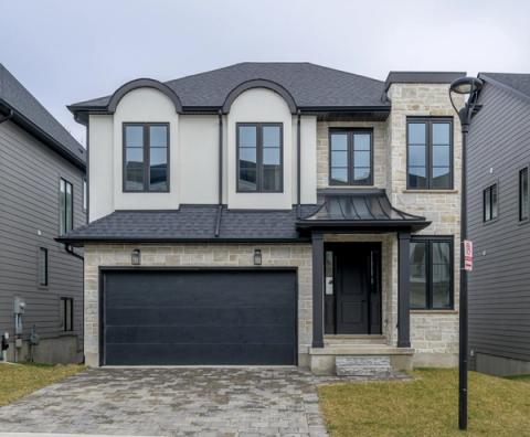 This move-in-ready open concept home offers premium finishes, fantastic floor plan & huge windows overlooking the green space. Enjoy 9 ft ceilings on both floors, and a heartwarming 46' gas fireplace in the spacious living room. The oversized kitchen island with a quartz countertop adds a touch of luxury, while custom black interior doors at 8 ft height elevate the sophistication. Finished lower level walk-out level w/ patio door entry backing onto the river & protected forest. This residence seamlessly combines elegance and functionality for immediate enjoyment.